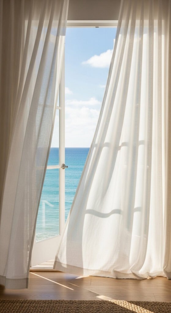 Coastal rooms need light. Replace heavy drapes with sheer white or natural linen panels. The lightweight fabric filters sun while maintaining brightness. Rooms feel larger and more connected to outdoors.
