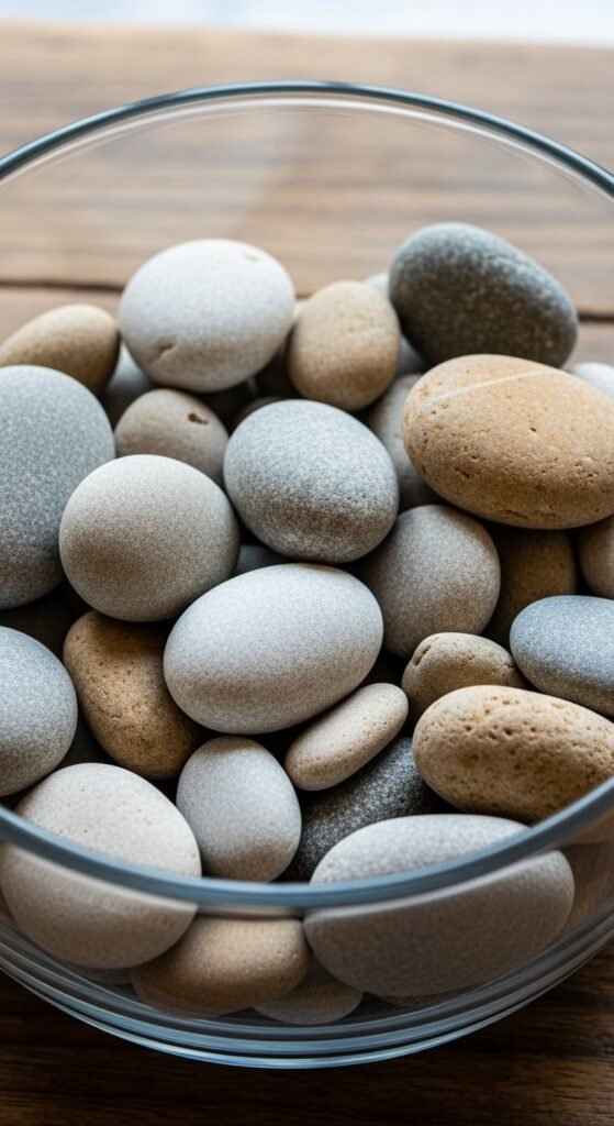 Collect smooth stones and pebbles from beaches. Display them in glass bowls, on trays, or scattered on shelves. The natural materials cost nothing and bring authentic beach texture home.