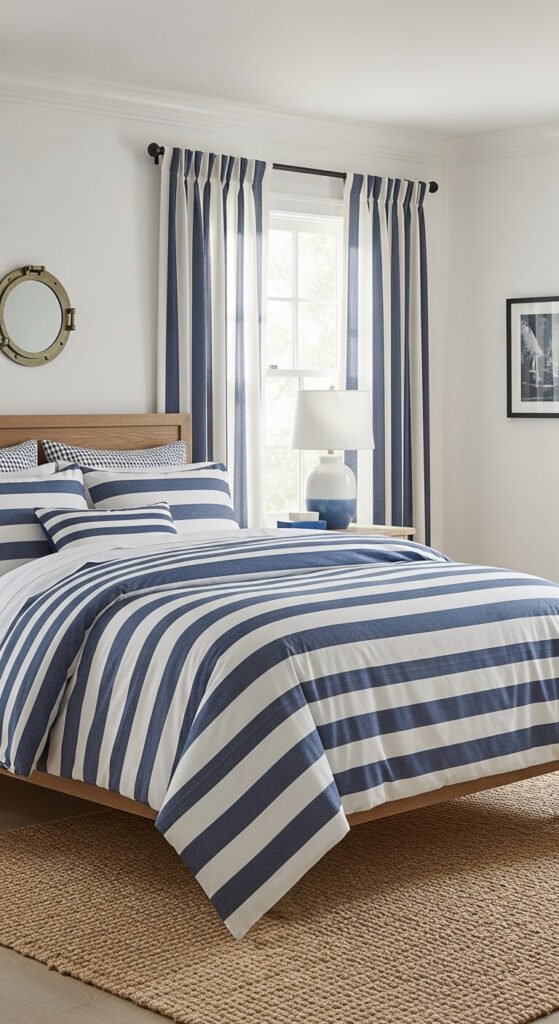 Stripes are coastal decor’s signature pattern. Navy and white combinations feel classic and nautical. Use them on pillows, throws, rugs, and bedding. The graphic lines add visual interest without overwhelming.