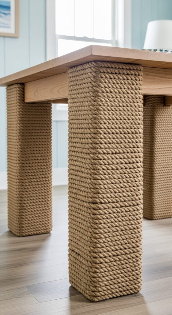 Start at the bottom and wrap tightly, gluing every few inches. Keep tension consistent for neat appearance. The neutral rope color works with any wood tone. This technique hides damaged or dated furniture legs. Works on dining tables, coffee tables, end tables, and floor lamps. The textural nautical detail communicates coastal style clearly. The DIY project takes 1-2 hours per piece. Rope wears well and can be replaced easily if it loosens or damages over time.