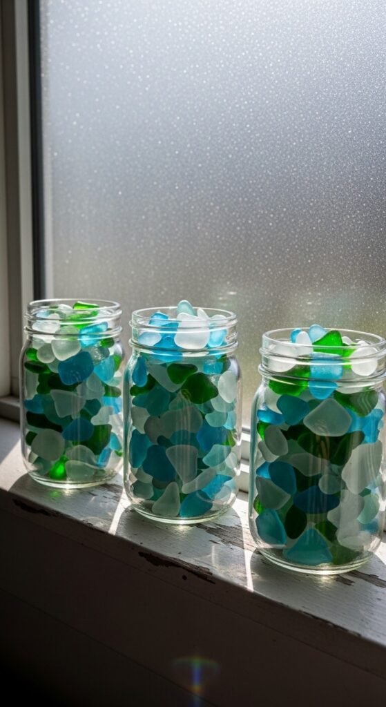 Fill clear glass jars or vases with sea glass. Place them on windowsills where light shines through. The frosted pieces glow beautifully. Sort by color or mix them together. Use sea glass to fill the bottom of candle holders or as decorative filler in apothecary jars. The aqua, green, and white tones bring subtle coastal color without paint or textiles. Kids love hunting for sea glass on beach trips. The collection grows over time, building vacation memories into your decor.