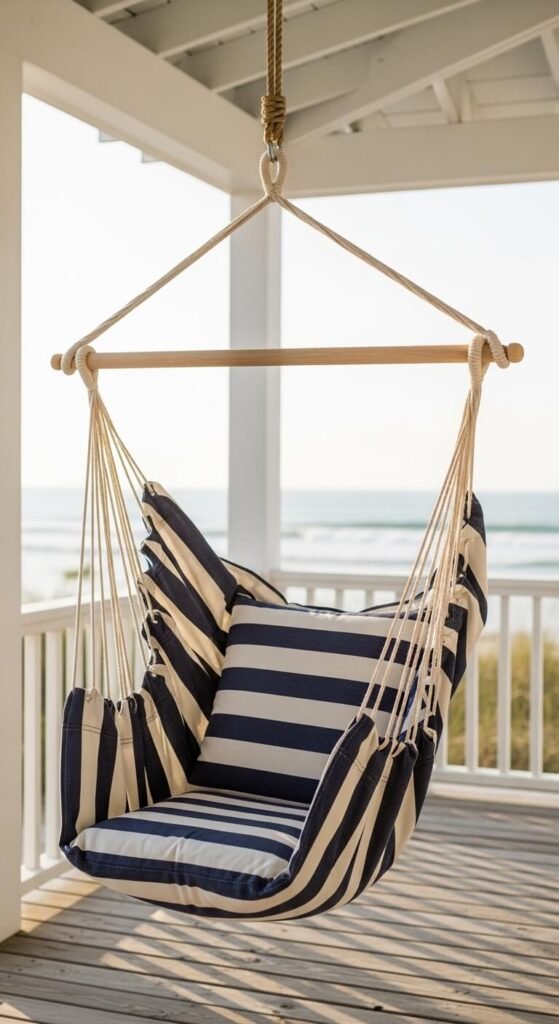 Hammock chairs bring vacation vibes daily. Indoor or covered porch versions run $50-$150. The suspended seating feels playful and relaxing. Striped canvas is the most coastal option.