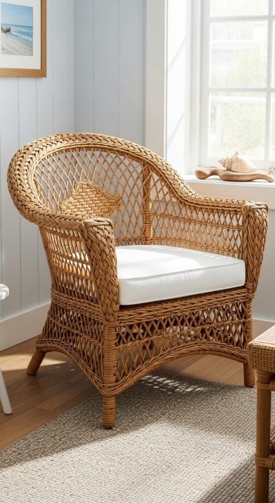 Painted white wicker reads more formal. Natural finish feels more casual. Both work in coastal spaces. Add cushions in coastal colors or patterns. Wicker works indoors despite its outdoor reputation. Use it for chairs, side tables, headboards, and storage baskets. The material improves with age—slight loosening and patina add character. The woven texture creates visual interest without pattern. Pair wicker with smoother materials like linen and wood for balanced rooms. This is coastal living room furniture at its most inviting.
