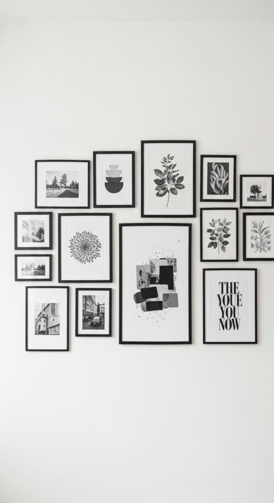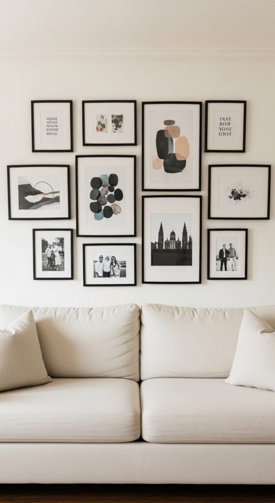 The most forgiving gallery wall layout uses a completely mixed collection of artwork and photographs unified by a single frame finish. Choose one frame color — all black, all white, or all natural wood — and apply it to every single piece regardless of size or content. The unified frame finish is the thread that holds an otherwise diverse collection together. Buy inexpensive frames from discount stores and spray paint them all in the same matte finish — one $4 can covers ten to twelve frames. Lay the arrangement on the floor before hanging. Start with the largest piece, center it at eye level, then build outward from there.