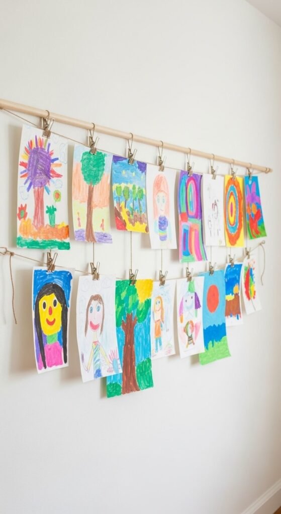A clip-rail gallery system for children’s artwork solves both a storage problem and a display opportunity simultaneously. Mount a wooden picture rail or a length of wooden dowel at child eye level and use small binder clips or wooden pegs to hang artwork without any frames or holes in the wall. The clip system lets you rotate pieces in and out as new artwork arrives without any rehang process. A wooden dowel from a hardware store costs $3 to $5. Twelve binder clips cost $1. String or twine for hanging costs $2. The whole system costs under $10 and makes children feel genuinely proud that their work is displayed rather than stored in a drawer.