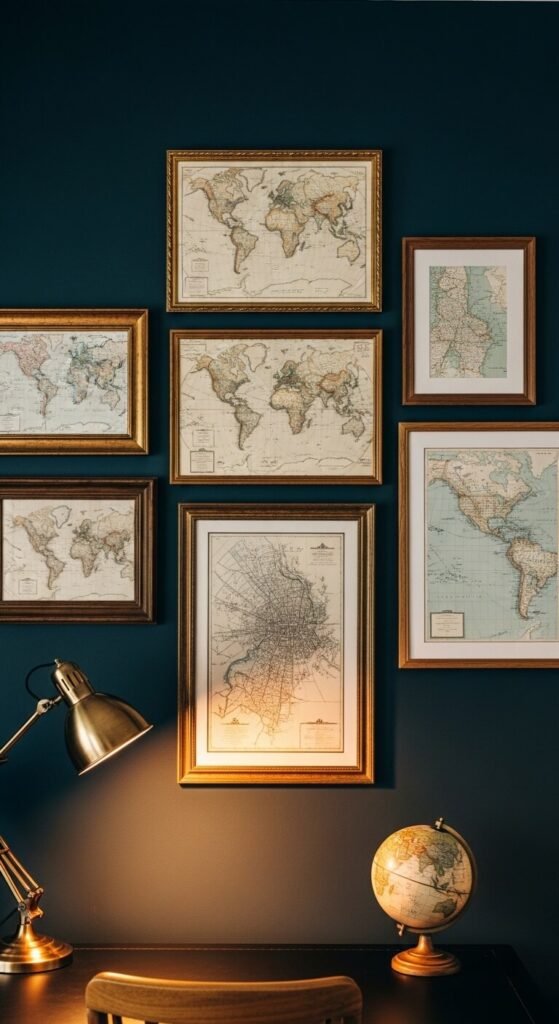 A curated collection of vintage or antique-style maps creates a gallery wall with strong intellectual character and visual texture. Use maps of places that are personally meaningful — where you grew up, where you traveled, where you met your partner — rather than generic decorative maps. Download high-resolution vintage maps free from the David Rumsey Map Collection online and print them at a copy shop for $3 to $8 per map. Frame in a mix of ornate gold and simple dark wood frames for a collected, over-time quality. A dark navy or forest green painted wall behind the maps makes the sepia and cream tones read dramatically richer.