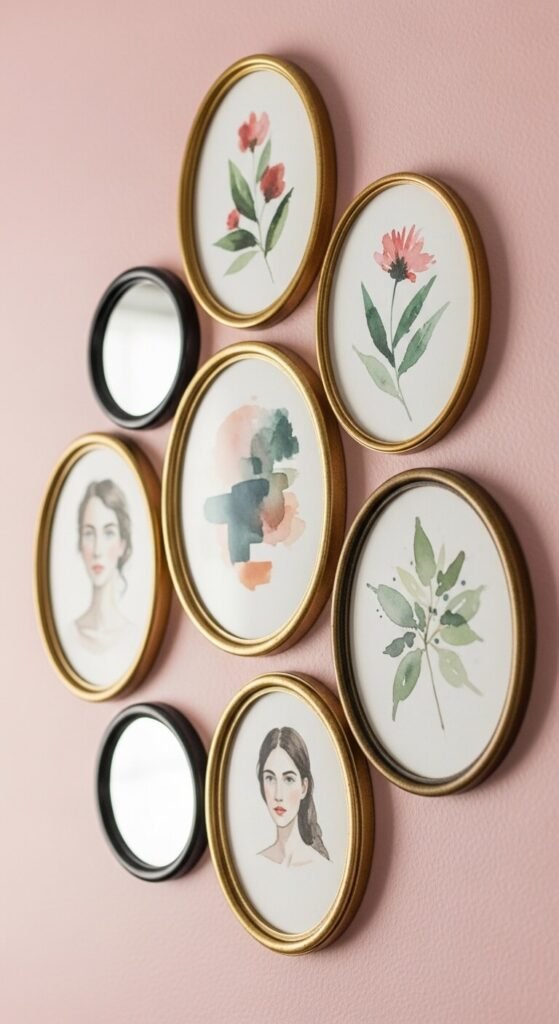 A gallery wall built around oval and round frames rather than the standard rectangular format creates an unexpected, romantic quality that suits bedrooms, dressing rooms, and powder rooms particularly well. Mix oval gilded frames, small circular frames, and one or two round mirrors in a tight organic cluster rather than a formal grid. The curved edges of the frames relate naturally to each other and create flowing eye movement through the arrangement. Oval frames from thrift stores and antique shops cost $3 to $15 each. Fill them with your own watercolor paintings, downloaded floral prints, or personal photographs printed in soft tones.