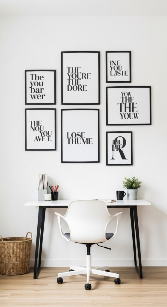 A gallery wall built entirely from typographic prints creates a wall that communicates directly through words rather than images. Keep the typography consistent — use all the same typeface across every print, varying only the size and the words. This creates a family of prints that work as a system. Design your own prints free using Canva or Google Docs and print at a copy shop for $2 to $5 each. Choose quotes, single words, or phrases that are personally meaningful rather than generic inspirational text — the personal specificity is what makes this type of wall interesting. All-black typography on white paper in black frames is the most graphic and universally suitable version.