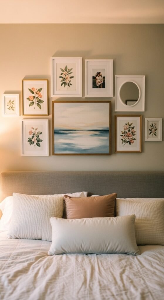 A gallery wall above a bed headboard transforms the most dominant surface in a bedroom into a personal, curated display. Center the arrangement above the headboard width and keep the lowest frame at least 8 to 10 inches above the headboard top to avoid impact with pillows. Choose content with softer tones and more intimate subject matter — botanical prints, personal photographs, abstract watercolors, and one small mirror all suit a bedroom gallery. Avoid strong graphic or typographic pieces that feel too stimulating for a sleep space. A bedroom gallery of nine frames in mixed warm finishes costs $30 to $60 using thrift store finds and printed artwork.