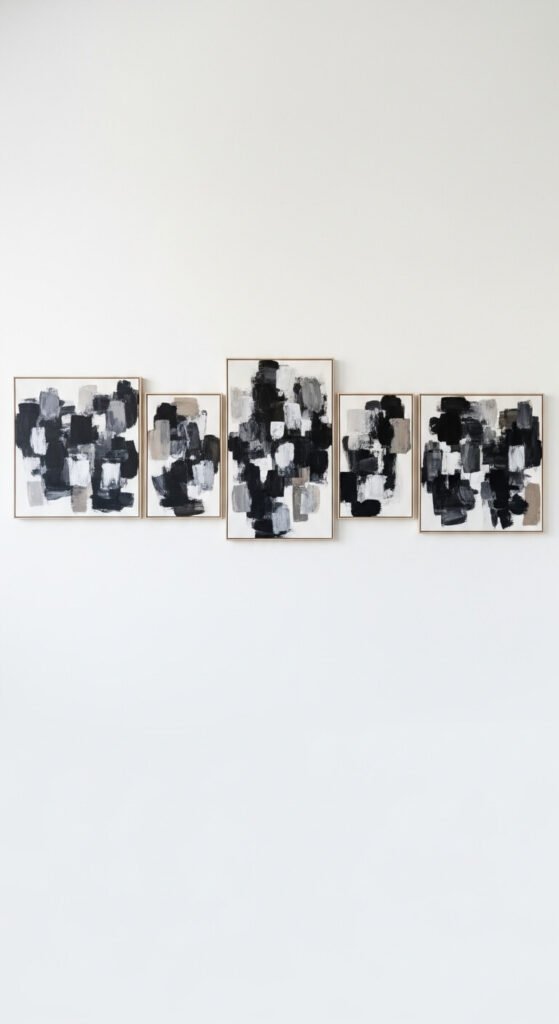 A series of abstract works in the same monochrome palette hung in a straight horizontal row creates one of the most sophisticated gallery wall layouts available. Paint five or six canvases yourself using only two or three colors in the same family — all greys, all earth tones, or all cool blues. Each canvas is a distinct abstract composition but the shared palette makes the series read as a unified body of work. Blank canvases from a craft store cost $3 to $8 each. Basic acrylic paint costs $2 to $4 per tube. A series of six hand-painted abstract canvases costs under $40 in materials and looks genuinely gallery-worthy when hung with precision.