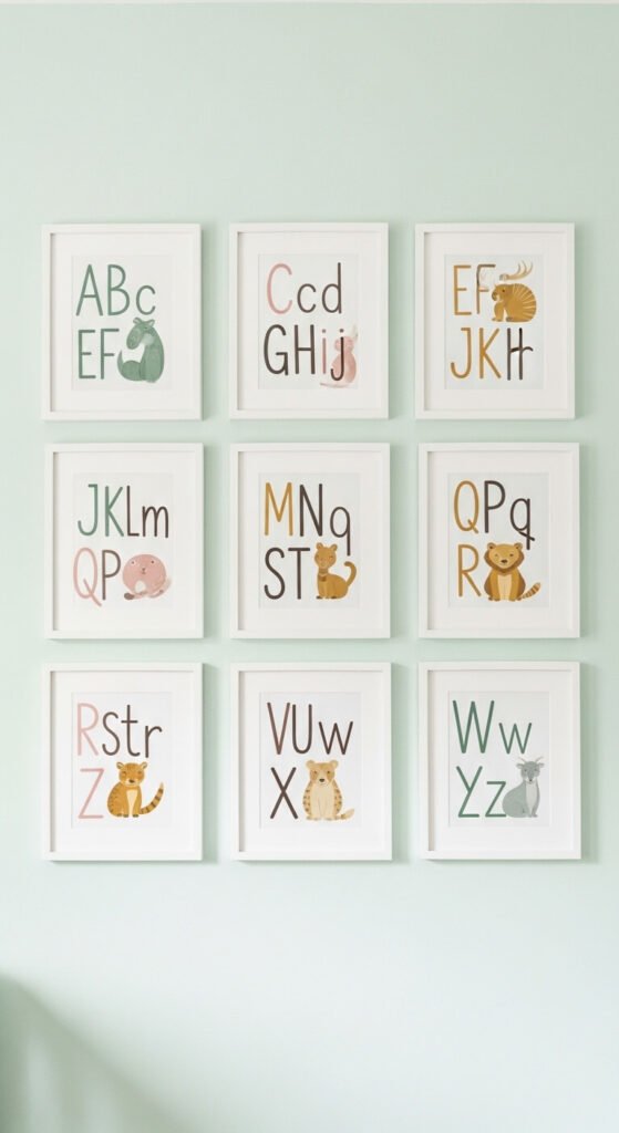 An alphabet print gallery wall in a nursery combines visual learning with decorative intention in a way that suits the space perfectly. Download or purchase a matching set of illustrated alphabet prints in a consistent illustration style and color palette. Mount all 26 in a grid — a 4×7 grid minus two spaces, or broken into multiple smaller groupings. Matching white frames from a discount store cost $3 to $6 each for a 5×7 size. A full alphabet set of prints from Etsy costs $15 to $30 as a digital download that you print yourself. The uniformity of the matching frames and illustration style makes a large grid of 26 pieces look ordered and intentional rather than cluttered.