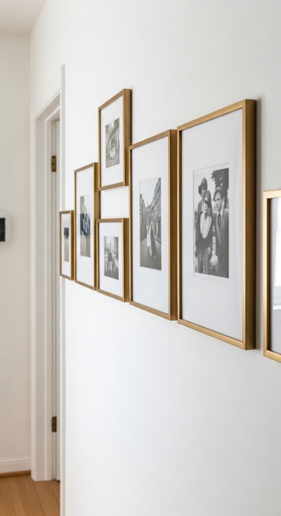 A narrow wall between two doors, a window, or architectural features suits a single precise horizontal row of frames far better than any multi-row arrangement. Align the center of every frame along a consistent horizontal line using a spirit level, varying only the width of each frame. Keep the same frame height throughout even if widths differ. This creates a ribbon of images that reads as a single continuous display rather than individual pieces. Mount the center line at standard eye level — 57 inches from floor to center of frame is the museum standard. One row of seven brass-framed photographs on a narrow wall costs $30 to $50 in total.