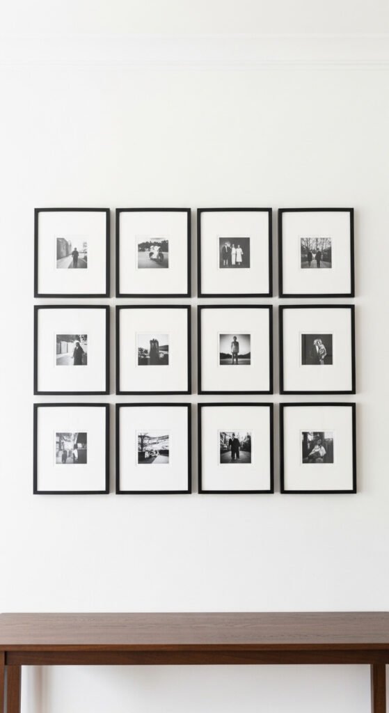 A grid of identical frames with matching prints is the most formal and graphic gallery wall layout. Use the same frame size, same frame finish, and same print style throughout — all black-and-white photographs, all botanical prints, or all abstract color studies in the same palette. Space frames exactly 2 inches apart throughout the grid using a level and measuring tape. This layout suits modern, Scandinavian, and minimalist interiors particularly well. Print a set of personal photographs in black-and-white at a copy shop for $1 to $3 each. A 3×4 grid of 8×10 frames costs around $40 to $60 in total materials and looks genuinely gallery-quality when hung with precision.