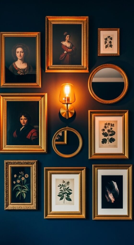 A deep-colored wall transforms every piece of artwork on it — gold frames glow, cream prints sing, and the whole arrangement feels richer and more dramatic. Choose a deep navy, forest green, charcoal, or burgundy for the gallery wall and select frames in warm metal finishes — brass, gold, and aged bronze all work beautifully against dark walls. Ornate gold frames from thrift stores and antique shops cost $3 to $20 each and look extraordinary against a dark background. A small wall sconce mounted among the frames adds a warm light source that gives the wall an atmospheric, evening-salon quality that no overhead light can replicate.