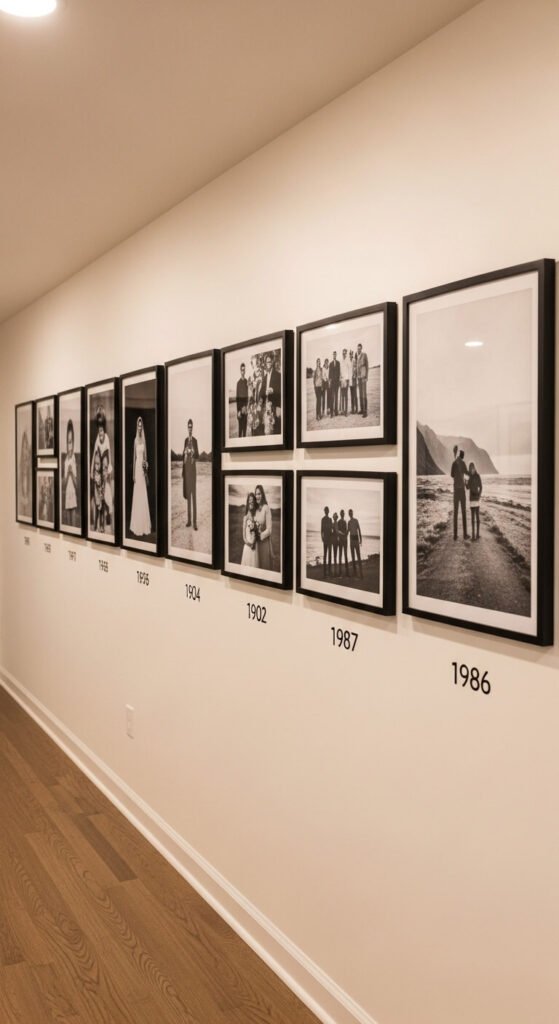 A personal photography timeline — photographs arranged roughly chronologically from left to right across a wall — creates the most genuinely narrative gallery wall possible. Print personal photographs that mark real chapters of your life at a consistent large-format size: 12×18 or 16×20 works well for this type of display. Black-and-white printing ties photographs from different decades and different cameras into a cohesive visual style. A set of 10 large-format black-and-white prints at a local print shop costs $30 to $60. Matching thin black frames cost $8 to $15 each. This is the gallery wall that visitors spend the most time standing in front of — and the one that means the most to the people who live with it.