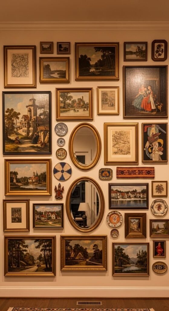 A maximalist gallery wall that fills an entire wall from floor to ceiling makes the strongest visual statement of any gallery wall format. The key to making density work is consistent spacing — maintain 1 to 2 inches between every single frame throughout the arrangement, regardless of size or content. This spacing discipline turns a crowded wall into a considered collection. Build it over time rather than all at once — a gallery wall that grows gradually looks more genuine than one purchased and hung in a single afternoon. Use thrift stores, estate sales, and art markets as your primary sources. Start with eight to ten pieces and add more over months and years.
