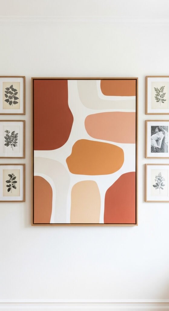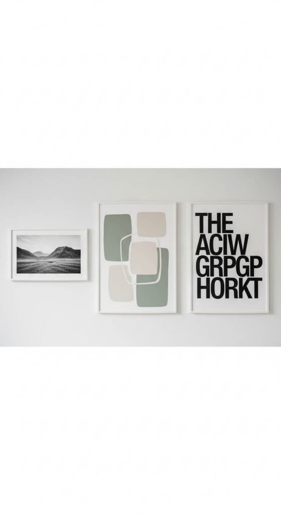 Sometimes less is the strongest choice. Three large pieces hung in a horizontal row with generous negative space between and around them creates a gallery wall that feels confident rather than cautious. Each piece should be large enough to hold attention individually — 24×30 or larger for each. The negative space between them is as intentional as the artwork itself. This layout suits modern minimalist and contemporary interiors where the wall architecture is as important as what hangs on it. Three large canvas prints from an online print service cost $30 to $60 each. Hang with precise horizontal alignment using a long spirit level. The result is clean, commanding, and immediately impressive.