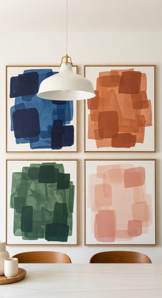 A series of large abstract color study canvases above a dining table gives the room a contemporary art gallery quality that suits the scale of a long dining wall perfectly. Paint each canvas as a large color field with loose gestural marks using one dominant color per canvas. Choose colors that relate to the dining room’s palette and to each other as a series. A set of four 24×24 canvases costs $12 to $32 in materials from a craft store. Basic acrylic paint in four colors costs $8. Thin natural wood frames from a discount framing supplier cost $15 to $25 each. A painted series of four costs under $60 total and suits any level of painting ability.