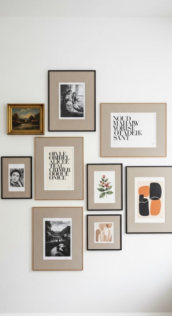 When the content of an eclectic collection is too varied for frame finish alone to unify, a consistent mount material becomes the thread that holds everything together. Linen, raw cotton, or wide white mats cut to the same border width across every piece visually equalize widely different artworks. The linen mount gives each piece a natural, textile warmth that suits eclectic and maximalist collections. Buy wide linen or cotton fabric at a fabric store and cut mat inserts to fit standard frames. This adds $2 to $5 per frame in material cost. The effect is substantial — a gallery wall that would otherwise look chaotic reads as cohesive and considered.