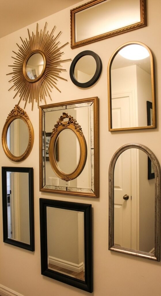A gallery wall composed entirely of mirrors in different shapes and frame finishes creates a functional display that makes any hallway or small room feel dramatically larger. Vary shapes — round, oval, sunburst, arch, and rectangular — and mix frame finishes — gold, black, antique silver, and natural wood. The varied shapes create movement; the mirror surfaces reflect light and the room back into itself, creating real spatial depth. Decorative mirrors from thrift stores and discount homeware shops cost $5 to $30 each depending on size and finish. A hallway of eight mirrors costs $50 to $100 total and functions simultaneously as decor and practical use. No artwork or printing required.