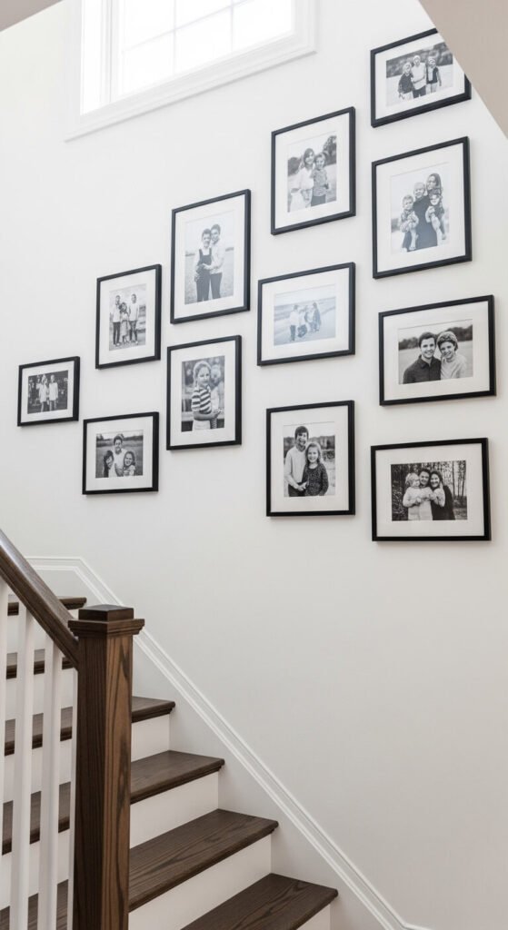 A staircase wall ascending gallery of black-and-white family photographs is one of the most emotionally resonant gallery walls you can create. Follow the diagonal line of the staircase, arranging frames so their centers align with an invisible line running parallel to the stair angle. Use the same frame finish throughout — all black or all white — so the varied photographic subjects remain the focus. Print a collection of personal photographs in black-and-white at a local print shop for $1 to $3 each. A staircase gallery of 15 to 20 photographs costs under $60 in total frames and prints from discount frame shops.