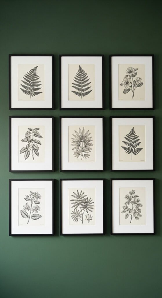 A dedicated botanical print collection hung as a grid creates one of the most consistently well-received gallery wall styles in any interior. Download free antique botanical illustrations from public domain archives — the Biodiversity Heritage Library and Rawpixel both offer thousands of high-quality historical botanical engravings free to download. Print on cream cardstock at a local copy shop for $2 to $4 per print. Mount in identical frames with wide white mats. A 3×3 grid of 12×16 framed botanical prints on a dark-painted wall costs under $50 total. The dark wall makes the cream prints read as dramatically more expensive than they actually are.