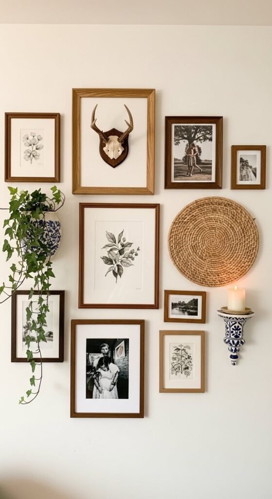 A gallery wall becomes more interesting when it includes three-dimensional objects alongside flat framed pieces. Hang woven wall hangings, small ceramic wall planters, decorative mirrors, mounted antlers, a small wall-mount shelf, or a sculptural wall object alongside frames. The dimensional objects create shadows and depth that flat prints cannot. Mix them at irregular intervals throughout the arrangement so they feel discovered rather than placed. Woven wall hangings from independent makers cost $15 to $40. Small ceramic wall planters cost $8 to $20. Incorporate these alongside your printed and photographic pieces to give the wall a genuinely three-dimensional quality that photographs and visitors both respond to.