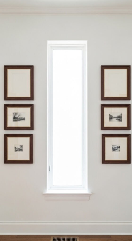 A symmetrical two-panel arrangement on either side of a window, door, or fireplace creates a formal, architectural gallery wall that suits traditional and transitional interiors particularly well. Treat each side as a mirror image of the other — same frame sizes, same positions, same content type. Use a central architectural feature like a window or fireplace as the axis. The symmetry does the compositional work — individual pieces within each panel do not need to be particularly striking because the overall arrangement carries the visual weight. This is one of the most approachable gallery wall layouts for people who find asymmetric arrangements difficult to plan confidently.
