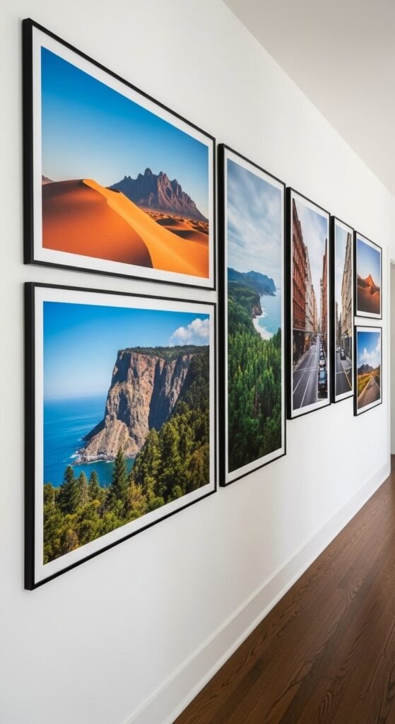 A hallway is ideal for a travel photography gallery because the long linear space suits a single horizontal row of images seen in sequence as you walk through. Mount large-format landscape photographs at consistent eye level in a single horizontal line, spacing them evenly at 3 to 4 inches apart. The consistency of the line is the organizing principle — content and color within each image can vary freely. Print your own travel photographs in large format at an online print service — a 12×18 print costs $5 to $10. Simple thin black frames from a discount store cost $8 to $15 each. A hallway of ten travel photographs costs around $100 to $150 total.