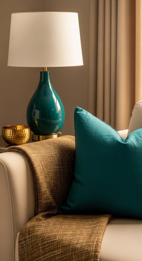 Teal and gold is a classic jewel-tone pairing that creates a sense of richness and depth in any neutral room. Teal — a blue-green with depth — and gold — warm metallic — create a complementary combination where each color makes the other appear more saturated and luminous. Use teal in ceramics, cushions, and lamp bases and gold in metallic accessories, lamp fittings, and picture frames. Keep the background neutral so the combination reads clearly. Budget tip: gold spray paint applied to plain ceramic or plaster accessories transforms affordable objects into convincing metallic accent pieces at minimal cost.