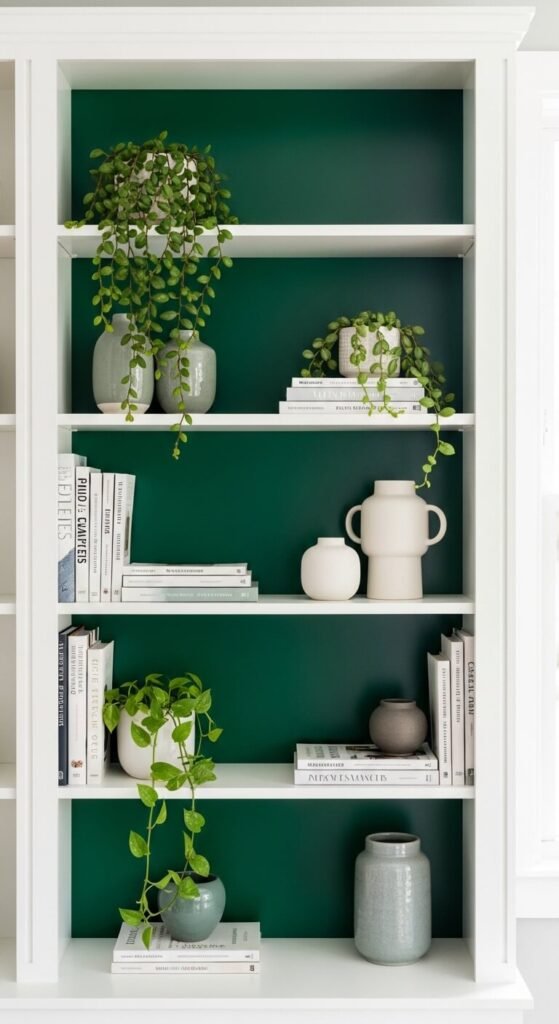 Painting only the interior back panel of a bookcase in a bold, saturated color creates a jewel-box effect that makes every object displayed on the shelves appear more curated and deliberate. The bold color provides a backdrop that makes ceramics, books, and plants stand out clearly. Use full-gloss paint for the most reflective depth, or a matte finish for a softer effect. Deep emerald, cobalt blue, mustard, or burnt orange all work beautifully. Budget tip: a small tin of interior paint is sufficient for most bookcase back panels — this is one of the most cost-effective color interventions possible.