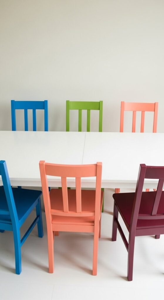 A set of matching-silhouette dining chairs in different bold colors creates one of the most joyful color statements in any home. The consistency of form — all chairs the same shape — keeps the mix of colors from feeling chaotic. Use five or six colors from the same saturation level rather than mixing bright and muted tones, which can look inconsistent. Each chair should have the same finish — all matte or all gloss. Budget tip: second-hand wooden dining chairs of the same basic style can be spray-painted in bold colors for around $10 to $15 per chair using exterior-grade spray paint.