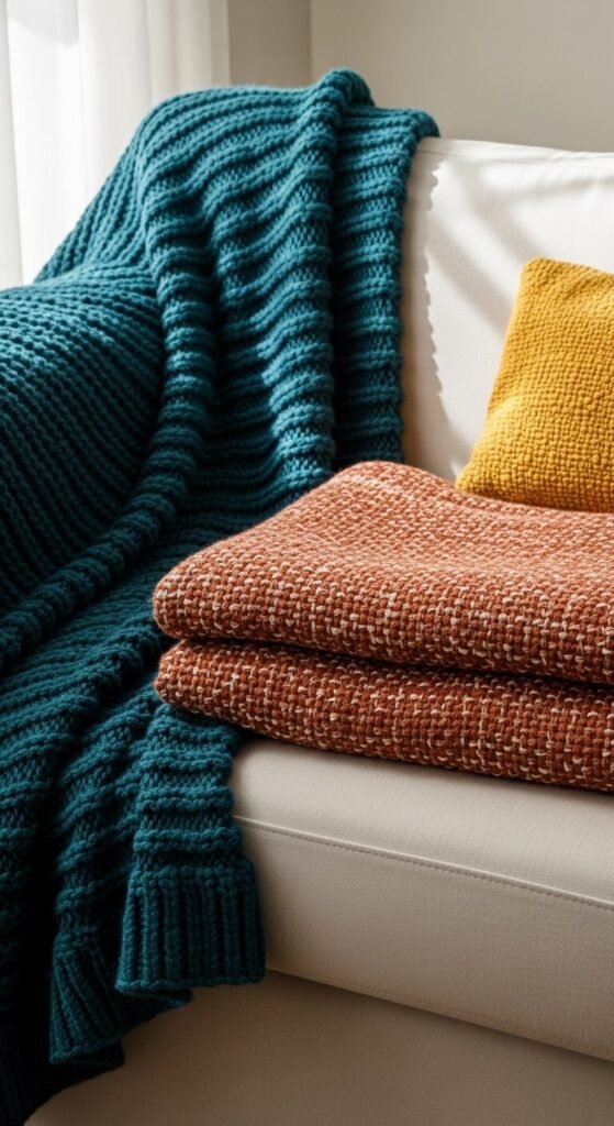 Bold-colored textured throw blankets — in chunky knit, woven cotton, or boiled wool — are the most immediately changeable color element in any room. A deep teal knit, a rust woven throw, or a mustard yellow blanket draped over a neutral sofa introduces vibrant color that can be switched out by season, mood, or occasion at minimal cost. The texture of the throw adds visual interest on top of the color. Layer two or three throws in related colors for the most impactful look. Budget tip: throws in bold colors are available at almost every price point — market stalls and discount stores regularly stock genuinely beautiful woven versions.