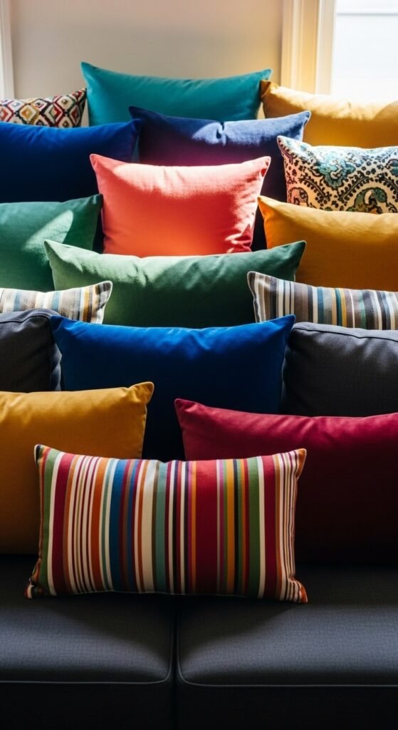 A maximalist cushion arrangement in deliberately contrasting bold colors creates a sofa that reads as exuberantly decorated rather than casually styled. The key is choosing colors that share the same saturation level — all jewel tones or all earthy tones — so the mix feels intentional. Include at least one patterned cushion that contains multiple colors from the collection to tie the group together. Use a dark sofa in charcoal or deep navy as the background — it makes every colorful cushion appear more vibrant than a white or cream sofa background. Budget tip: mix high and low-cost cushion covers — the visual impact comes from the combination, not the individual price.