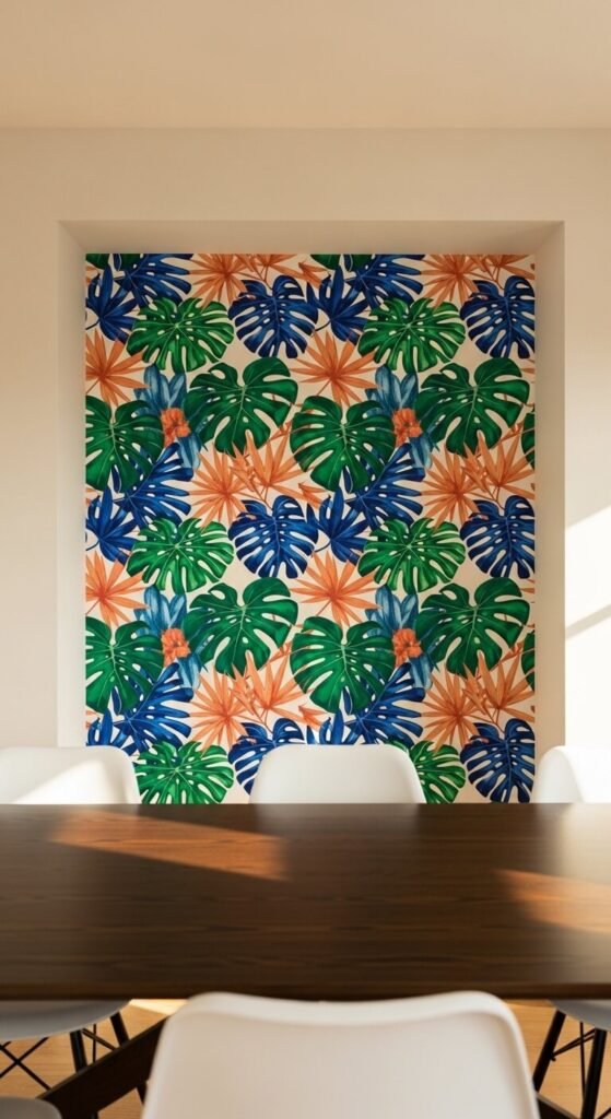 Vibrant botanical print wallpaper on a single feature wall introduces multiple colors simultaneously through illustrative pattern rather than plain paint. Large-scale tropical leaf prints in emerald, cobalt, and terracotta on a cream ground create maximum visual impact while the cream ground prevents the wall from feeling too dark or heavy. Pull individual colors from the wallpaper for cushions and accessories in the rest of the room — the pattern has already done the color-pairing work. Budget tip: peel-and-stick botanical wallpaper is fully removable and available in genuinely beautiful designs from many online retailers, making it ideal for renters.