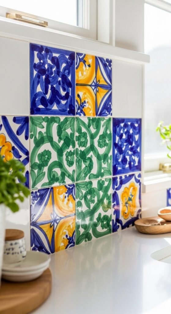 Hand-painted or encaustic colorful tiles used as a kitchen splashback create a permanent color installation that functions as art within the kitchen. A splashback with cobalt blue, terracotta, and forest green tiles in a mixed pattern creates the most visually rich result. A small splashback area uses relatively few tiles — keeping even premium hand-made tile costs manageable for this scale. Budget tip: plain white subway tiles with colorful grout (deep blue, forest green, or terracotta-toned grout) create an inexpensive color pop that can be achieved at standard tile pricing — the color impact comes entirely from the grout rather than the tile itself.