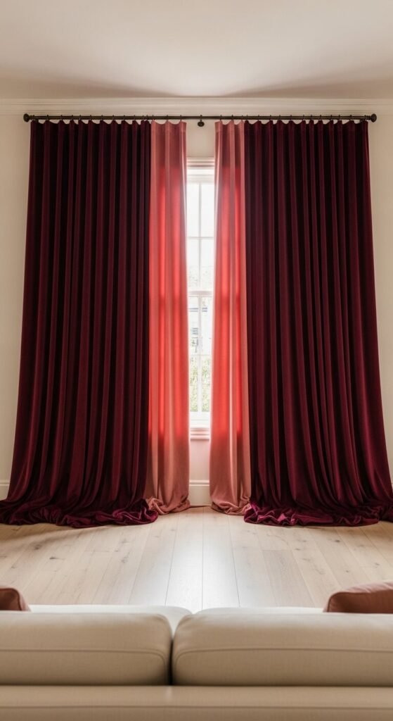 Floor-to-ceiling deep burgundy velvet curtains create one of the most dramatic single color statements possible in a living room or bedroom. The sheer scale of full-height curtains means even a single bold color introduces a substantial area of saturated tone. Velvet specifically amplifies color depth — the directional pile creates shifting tones between dark and mid-tones throughout the day. Pair with cream and warm white furnishings to allow the burgundy to dominate. Budget tip: curtain fabric in velvet or velvet-effect polyester by the metre from fabric suppliers is significantly cheaper than pre-made velvet curtains of the same length and fullness.