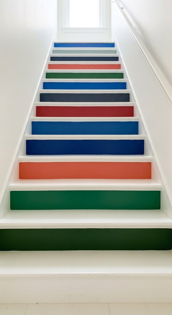 Painting a colorful “runner” effect directly onto staircase treads using a rectangular panel of bold paint on each step creates a dramatic architectural color statement at very low cost. Use different bold colors on alternating treads — cobalt, coral, and forest green — or a single consistent color across all treads. Floor paint or porch paint is the appropriate finish for durability. Stencil the panel edges with painter’s tape for clean lines. Budget tip: a single staircase color effect using floor paint costs under $50 in materials and takes a weekend to complete — one of the most impactful DIY color projects available.