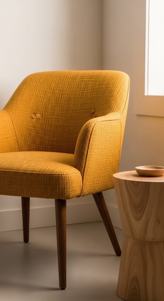 Mustard yellow is one of the most livable saturated colors in home decor — warm, golden, and energizing without the aggression of a primary yellow. An accent chair in mustard brings immediate warmth and personality to a neutral room. The mid-century silhouette with tapered legs is the most complementary shape for mustard upholstery — it balances the warmth of the color with clean, architectural form. Pair with deep teal or rust accessories for the richest colour combinations. Budget tip: mustard yellow fabric by the metre is widely available for DIY reupholstering an existing chair frame at a fraction of new furniture cost.
