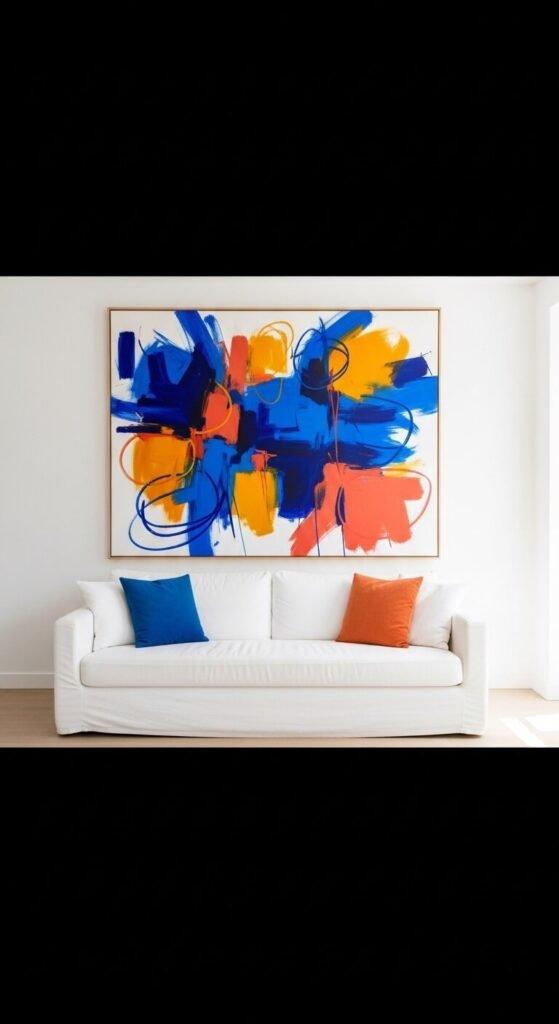 A single large, vibrant abstract artwork used as the color anchor for an entire room is one of the most effective ways to introduce multiple bold colors cohesively. Choose artwork with three to four strong colors, then pull each color through the room in cushions, ceramics, and throws. The artwork establishes the palette — every other color decision simply references it. This approach looks sophisticated because the color relationships are pre-established by the artist’s composition. Budget tip: digital art prints from independent artists on platforms like Society6 or Redbubble can be printed large-format at home print services for under $40.