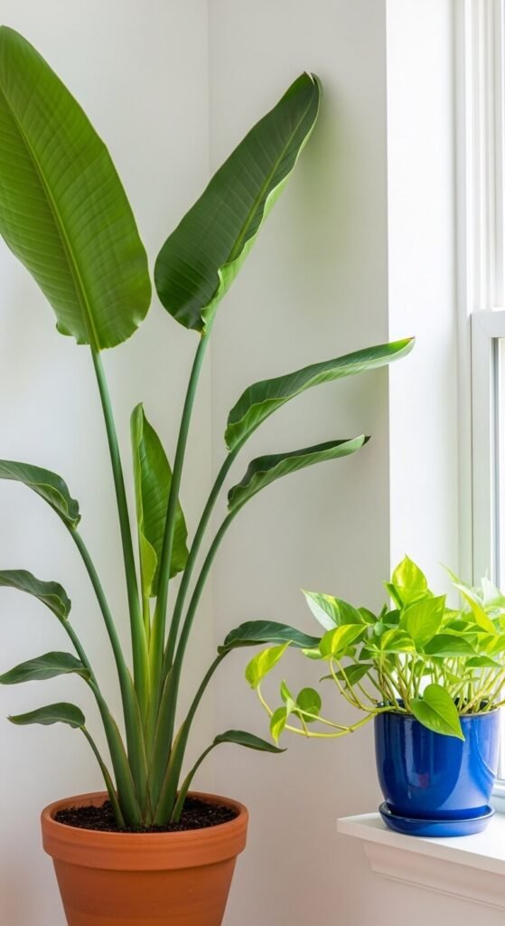 Large-scale tropical plants — bird of paradise, monstera, fiddle-leaf fig, or golden pothos — introduce vivid natural green and yellow tones that no painted or printed element can replicate. The combination of deep green foliage with brightly colored pots in cobalt, terracotta, or canary yellow creates a layered color statement that also improves air quality and connects the interior to nature. Tropicals grow toward natural light — position them near windows for the most dramatic, healthy foliage display. Budget tip: cuttings from friends’ established plants propagated in water are free and grow into full plants within months.