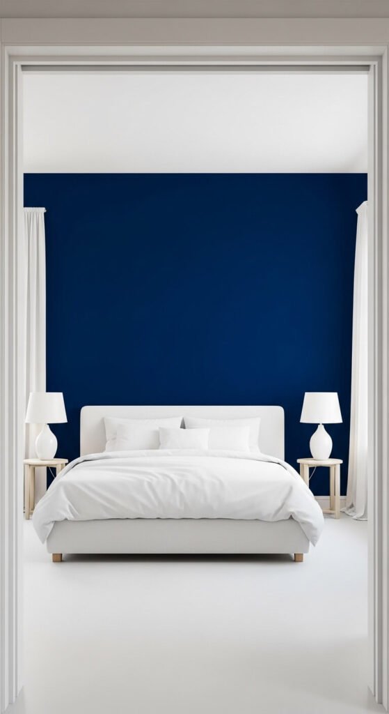 A single jewel-toned accent wall — in sapphire blue, deep emerald, or rich plum — behind a bed or sofa creates immediate depth and drama without committing to a fully saturated room. The contrast between the bold wall and the surrounding white walls is where the impact lives — keep the other three walls plain white to maximize this effect. Use a flat matte finish for the richest color depth — gloss or satin finish on accent walls can look overly shiny at this scale. Budget tip: a single accent wall uses less than one litre of paint at most — even premium paint is affordable for a single wall.