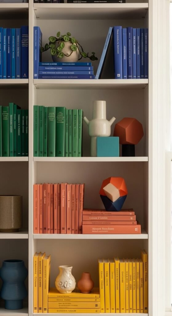 Organizing books by spine color on a white bookshelf creates a striking, colorful installation that requires no additional purchases — just reorganization. Group spines in color blocks: cobalt blue together, terracotta together, forest green together. Add colorful ceramic objects and small plants between the color-grouped book sections. The result reads as a curated color composition rather than a functional storage unit. This is the single most impactful zero-cost colorful decor move available — it uses only objects you already own, rearranged with color intention.