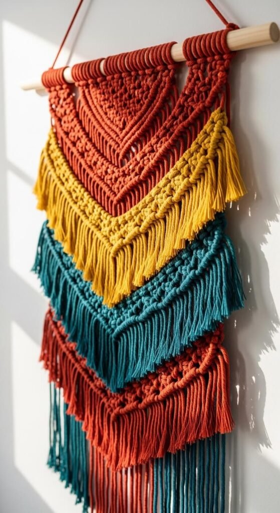 Colorful macramé or woven textile wall hangings in bold, saturated dyed cord create a warm, textural color statement that combines art and craft. A hanging in rust, mustard, and teal on a white wall introduces three colors simultaneously through a single decorative piece. Look for work from independent fiber artists on Etsy or at craft markets. Budget tip: basic macramé cord in cotton is available at craft stores for very little cost — natural macramé cord can be dip-dyed at home with fiber-reactive dye in any bold color. A beginner macramé hanging requires only basic square and spiral knots and can be completed in a few hours.