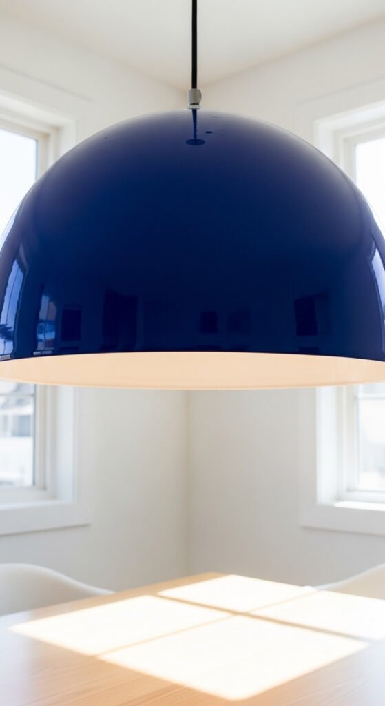 A single bold-colored pendant light above a dining table or in a hallway introduces vibrant color at eye level and above — a zone most decorating decisions ignore. A large dome pendant in cobalt, coral, or deep forest green enamel or ceramic creates a strong focal point that anchors the space below it. The interior of the shade — usually white — bounces warm light downward while the bold exterior faces the room. Budget tip: pendant light cords with pendant light holder kits are available from electrical retailers — pairing them with an affordable colored ceramic bowl shade from a pottery supplier creates a custom pendant at low cost.