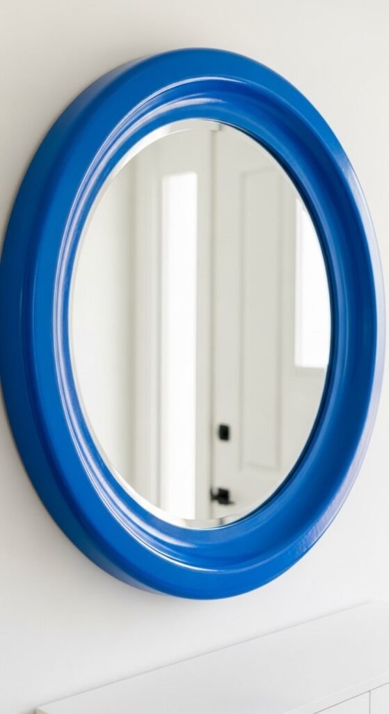 A large mirror with a boldly painted frame functions as both a colorful decorating accent and a light-reflecting functional piece. A round mirror with a thick frame painted in cobalt, emerald, or vivid coral against a white wall reads as a sculptural color statement. Plain wooden-framed mirrors from discount stores and thrift shops can be painted in any color using gloss paint — the transformation is immediate and dramatic. Budget tip: a $20 plain wooden mirror and a small tin of gloss paint in a bold color creates a result that looks like a $200 statement piece from a boutique home store.