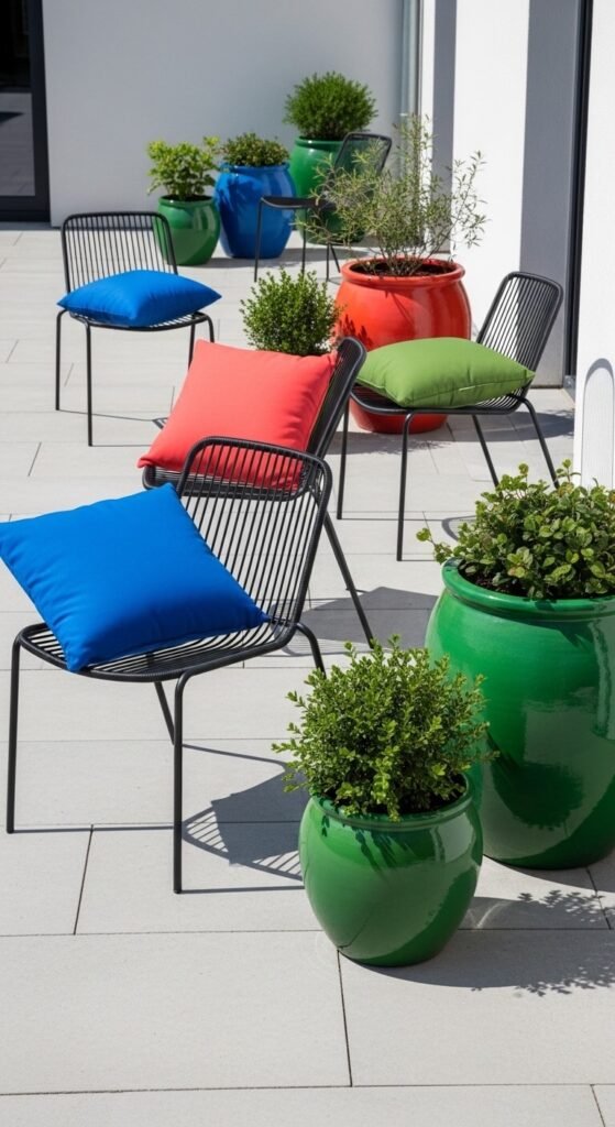 Bold, weatherproof outdoor cushions and brightly colored ceramic planters extend colorful decor to outdoor spaces — terraces, balconies, and gardens benefit from bold color just as interiors do. Use UV-resistant outdoor fabric cushions in cobalt, coral, and forest green on dark-frame metal garden furniture. Match or complement cushion colors with colorful ceramic plant pots in the same palette. Budget tip: plain terracotta garden pots spray-painted with weatherproof outdoor paint in bold colors are completely waterproof and UV-resistant once sealed — a full set of matching colored pots can be created for the cost of one or two cans of outdoor spray paint.