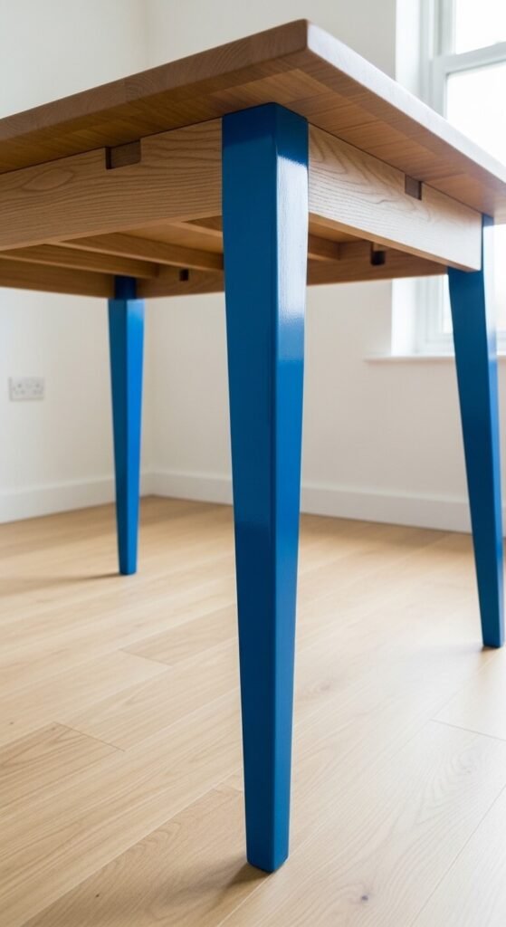 Painting just the legs of a table or chair in a bold, saturated color creates a colorful detail that is visible from a distance while remaining subtle enough to be surprising rather than overwhelming. Cobalt blue, vivid coral, or forest green on tapered furniture legs works particularly well — the geometry of the leg is emphasized by the color. Use gloss paint for maximum vibrancy and durability on legs that are handled and weight-bearing. Budget tip: furniture legs can be removed from most flat-pack tables and chairs, painted with a small brush, and replaced once dry — total material cost under $10 for a complete furniture transformation.