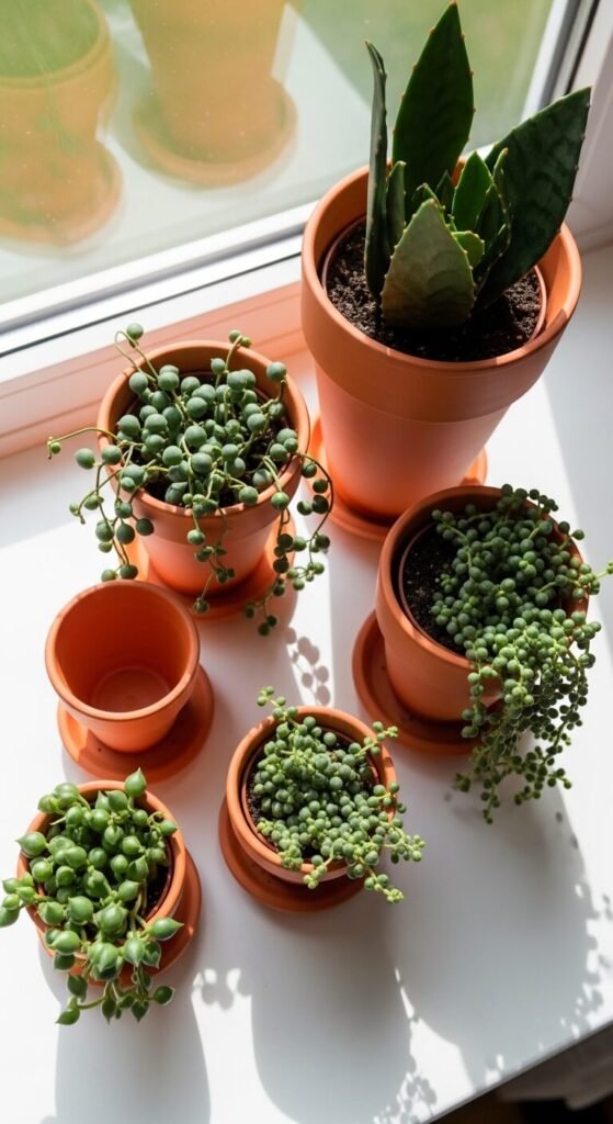 Terracotta-painted plant pots grouped on a windowsill or shelf introduce warm, earthy color through one of the most affordable decorating moves available. Paint plain terracotta or concrete pots with exterior terracotta-toned acrylic or chalk paint in two coats for full coverage. Group odd numbers — three or five — at varying heights for the most natural, organic arrangement. The combination of warm orange terracotta with dark green foliage is one of the most visually satisfying color pairings in home decor. Budget tip: plain terracotta pots from garden centers cost almost nothing and transform completely with a single can of spray paint.