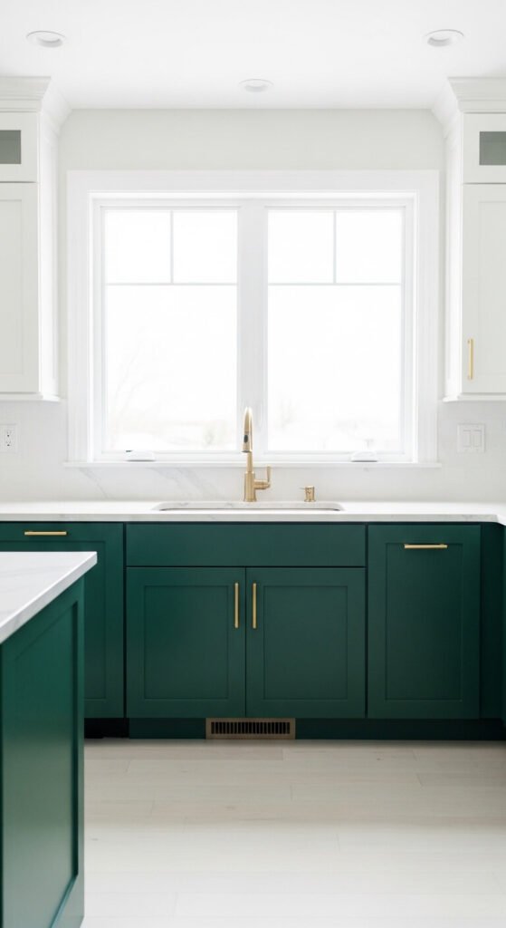 Emerald green lower kitchen cabinets against white uppers and pale stone countertops create a dramatic, jewel-toned kitchen that reads as genuinely sophisticated rather than trendy. The deep green has enough depth to feel rich and considered. Use brushed gold or brass hardware to complement the green rather than silver or black which can fight with it. This palette works in both traditional and contemporary kitchens. Budget tip: cabinet paint in jewel-toned greens is widely available — painting only the lower cabinet doors while leaving uppers white is a very achievable DIY weekend project that transforms the kitchen at paint cost only.